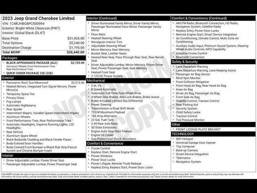 Key Chrysler Dodge Jeep Ram of Rochester is proud to present you with another True Market Priced Pre-Owned Vehicle. Transparent Pricing Of $ 32995 !! This 2023 Jeep Grand Cherokee Limited is loaded with the following Factory Options: 4WD Black Appearance Package (Gloss Black Exterior Accents, Molded In Color Black/Gloss Black Roof Rails, and Wheels: 20" x 8.5" Gloss Black Painted Aluminum), Quick Order Package 22E, 4WD, 3.45 Rear Axle Ratio, 4-Wheel Disc Brakes, 6 Speakers, ABS brakes, Active Noise Control System, Air Conditioning, Alloy wheels, AM/FM radio: SiriusXM with 360L, Anti-whiplash front head restraints, Audio memory, Auto High-beam Headlights, Automatic temperature control, Brake assist, Bumpers: body-color, Capri Leatherette Seats, Compass, Delay-off headlights, Driver door bin, Driver vanity mirror, Dual front impact airbags, Dual front side impact airbags, Dual-Pane Panoramic Sunroof, Electronic Stability Control, Emergency communication system, Four wheel independent suspension, Front anti-roll bar, Front Bucket Seats, Front Center Armrest w/Storage, Front dual zone A/C, Front fog lights, Front License Plate Bracket, Front reading lights, Fully automatic headlights, Garage door transmitter, Heated door mirrors, Heated front seats, Heated rear seats, Heated steering wheel, Illuminated entry, Knee airbag, Low tire pressure warning, Memory seat, Navigation System, Normal Duty Suspension, Occupant sensing airbag, Outside temperature display, Overhead airbag, Overhead console, Panic alarm, ParkView Rear Back-Up Camera, Passenger door bin, Passenger vanity mirror, Power door mirrors, Power driver seat, Power Liftgate, Power passenger seat, Power steering, Power windows, Radio data system, Radio: Uconnect 5 Nav w/10.1" Display, Rear anti-roll bar, Rear reading lights, Rear window defroster, Rear window wiper, Remote keyless entry, Security system, Speed control, Speed-Sensitive Wipers, Split folding rear seat, Spoiler, Steering wheel mounted audio controls, Tachometer, Telescoping steering wheel, Tilt steering wheel, Traction control, Trip computer, Turn signal indicator mirrors, Variably intermittent wipers, Voltmeter, and Wheels: 18" x 8" Fully Painted Aluminum!!
